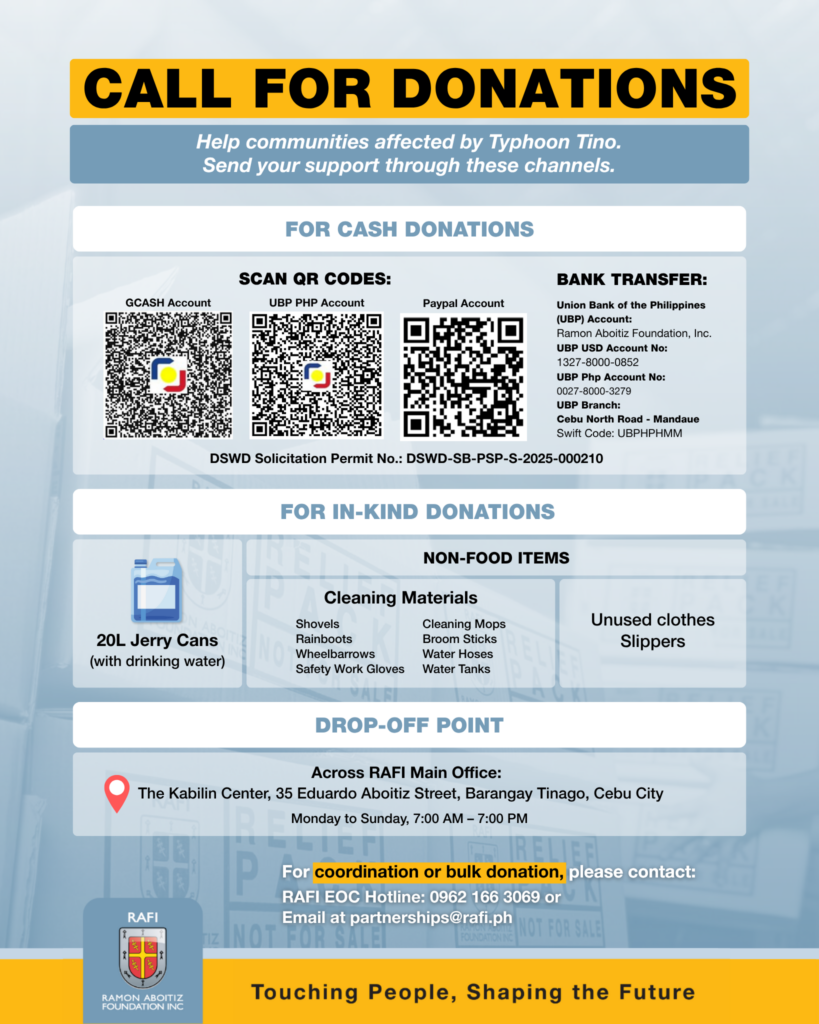 Cebu faces the challenge of rebuilding after consecutive disasters. RAFI calls for pagpahiuli; the restoration of lives, communities, and the environment. This call invites everyone to give back, to restore what was lost, and to renew what sustains us. In every act of compassion, there is a step toward renewal and a future strengthened by shared purpose.